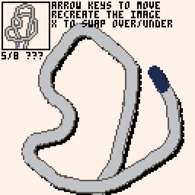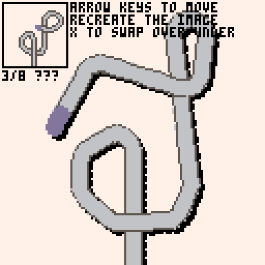 I thought this was really cool and satisfying until knot 7 didn't work (or it's unclear how to solve it, or I'm just very stupid. Either way, didn't feel fun). Otherwise great idea and I like how u used pico-8 for this one. :,)