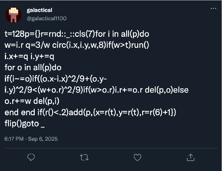 A self-playing game of Agario made entirely of code contained in one Tweet. Watch the video to learn more.